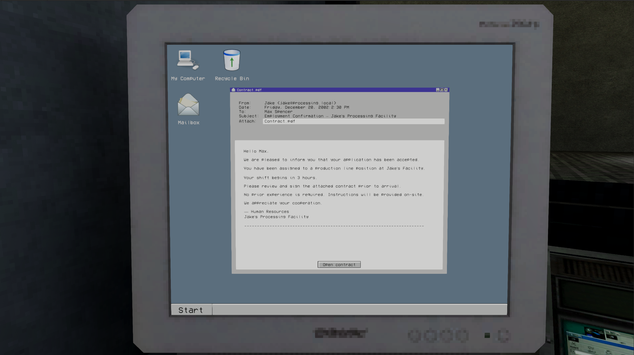 Line Worker is a short atmospheric game made for a 72-hour jam. You start a new job at Jake’s Processing Facility, sign a contract and begin a simple shift in quality control.